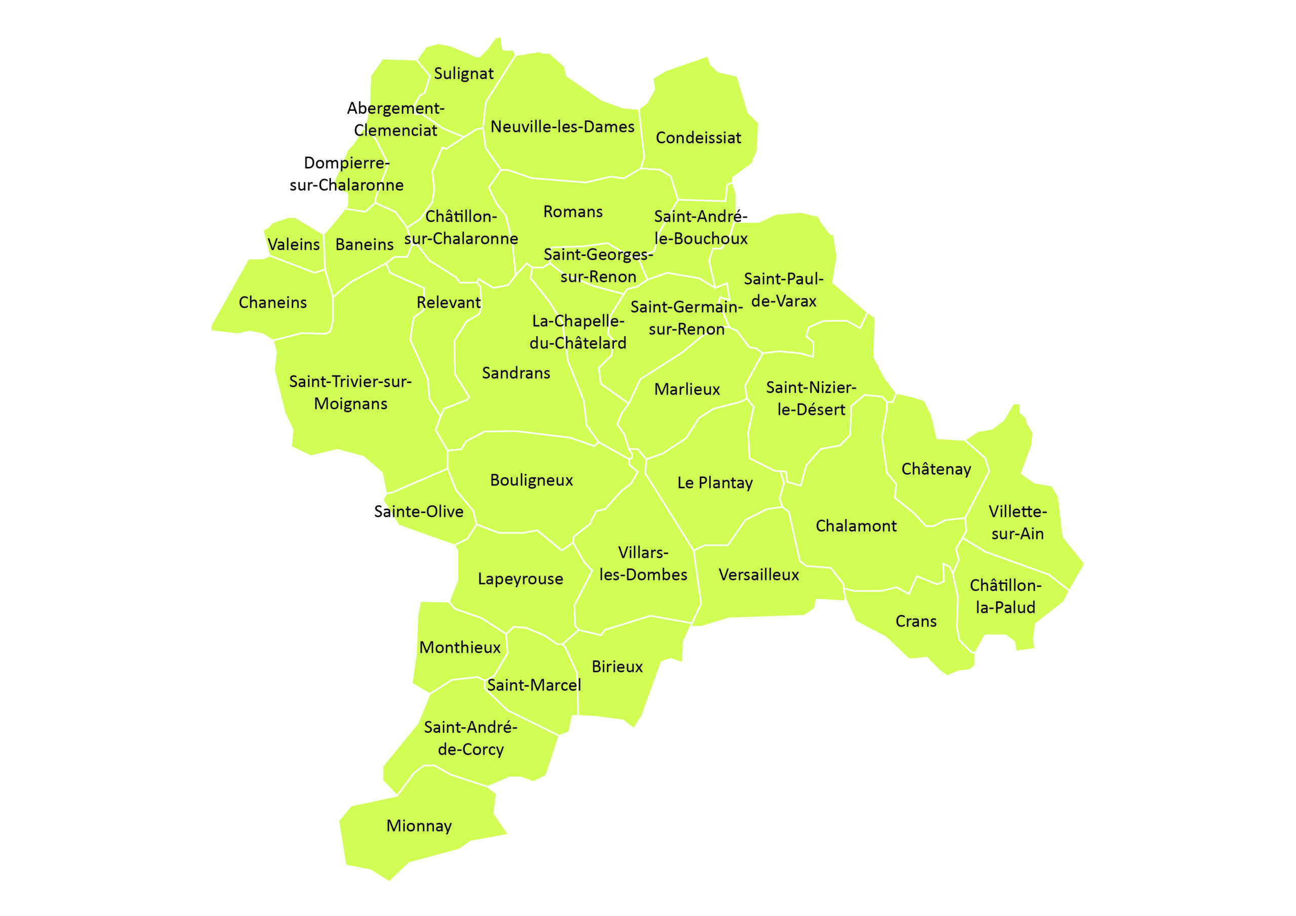 Retrouvez ci-dessous la carte de la Communauté de Communes de la Dombes et de ses 36 communes.